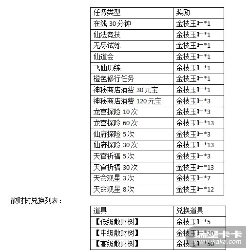 活动期间,玩家完成以下指定游戏内容可获得金枝玉叶,不同数量金枝玉叶可兑换不同级别的散财树;