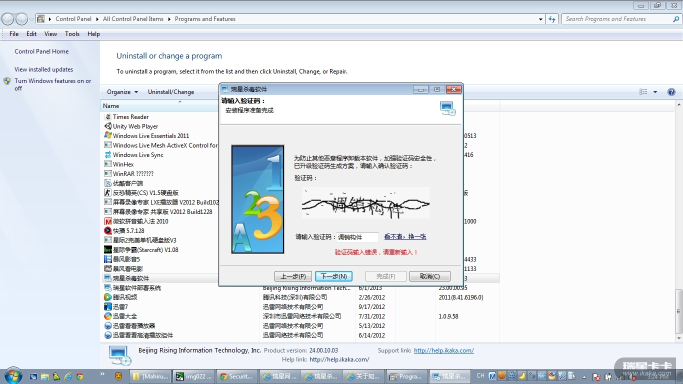 同样的问题,英文win 7 64位系统,因为下了瑞星全功能安全软件,在安装的时候提示要先卸载掉瑞星杀毒,然后发现在卸载的过程中输入中文验证码老是提示错误。实在是有些心惊,这软件就删不掉了?