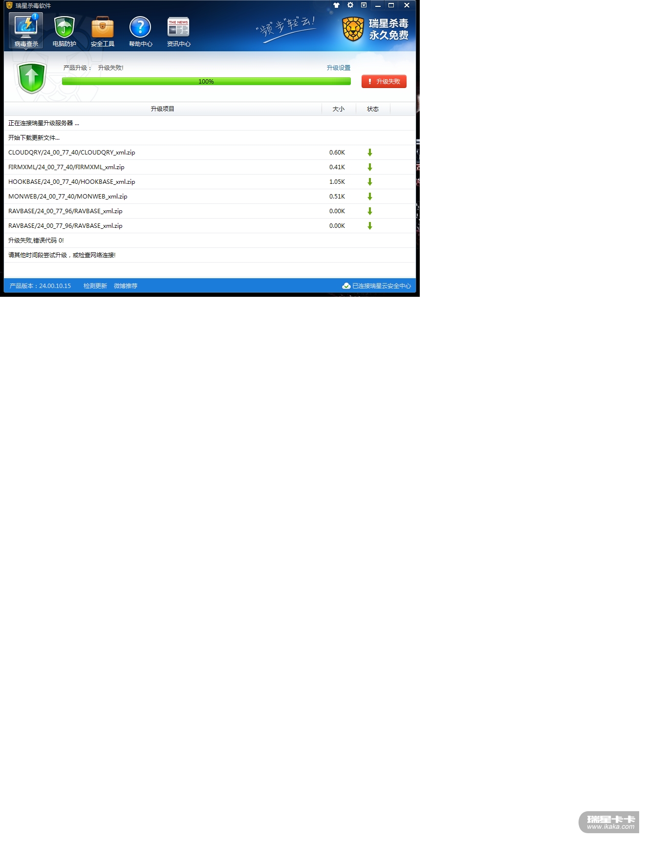 从日志分析,升级过程中下载这个文件失败,是网络问题导致的,请问现在瑞星能正常升级了吗?
