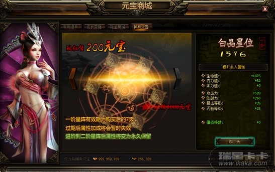 级后,开放新的星阵系统;在元宝商城的“神兵天器”中可以看到;新功能开放2