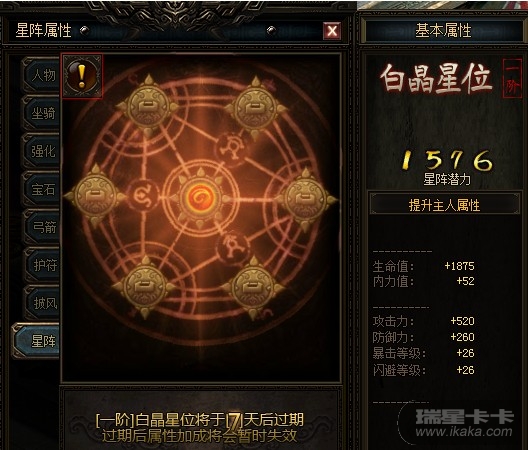 升阶星阵星阵的升阶同骑兵、暗器、披风等功能,1阶星阵拥有七天的持续时间,七天之内可以进阶到2阶黄晶星位后,即可永久拥有。升阶星阵和披风一样,拥有方便和直观的升阶进度值,当达到100%时升阶成功;
