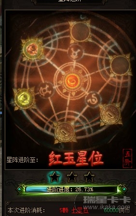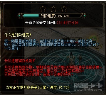 升阶进度和星星,4阶和以上的星位,会将整个升阶进度花费了3个阶段,每个升阶进度达到100%便会点亮一颗星,同时获得一部分下阶星阵的属性加成,当3个星全部点亮,则进阶成功;