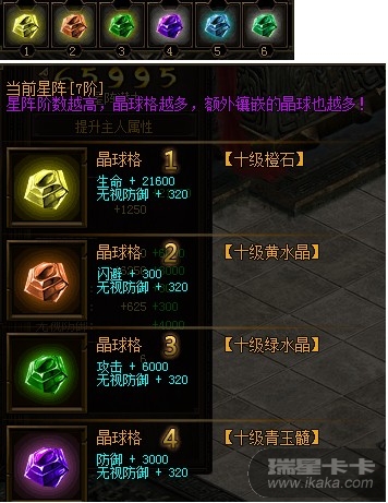 镶嵌星位晶石当星阵达到2阶时,开启星位晶石孔,可用于镶嵌晶石,增加无视防御伤害;星位晶石有以下几种: