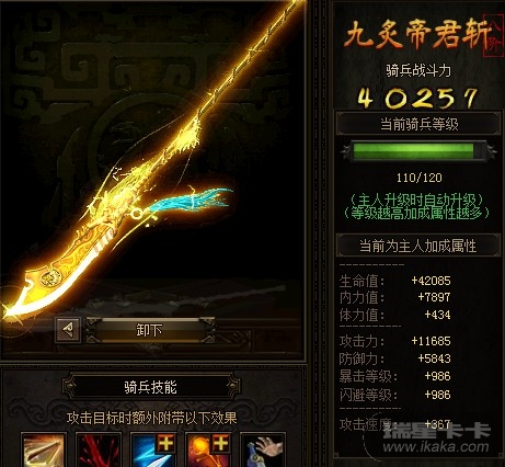 八阶骑兵九炙耀神光,帝君临天下,一斩倒阴阳!‘九炙帝君斩’,骑兵中的神骑兵,你怎能眼睁睁看着它从您眼前溜走?!九炙帝君斩源于神话,生于后羿,它的降临隐藏着一个惊天的爱情秘密。后羿射日,其实是为情所困,他爱上的女人爱上了别的男人,为了证明自己还是一个男人,为了心底那一口气,后羿提出了决斗,和在当时一个无比强大的情敌决斗——九炙帝君!九炙帝君又称九头炎君,在当时可谓只头遮天,他一生气就将九只脑袋挂在空中,炙烤着大地和百姓。决斗之惨烈程度让人瞠目结舌,两败俱伤之际,九炙帝君还剩下了一只脑袋,也就是元首,而后羿连拉弓的手都已经抬不起来了。最后关头,后羿鼓起毕生气力,将自身化为一支弓箭,朝着九炙帝君射去!一声晴空炸雷响起,九颗脑袋,后羿的弓箭,以及后羿自身,三者慢慢在空中融合为了一把神器——九炙帝君斩!在七阶骑兵的基础上,开启了八阶骑兵的进阶。进阶八阶骑兵需要以下2个条件:1.