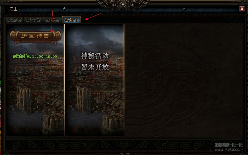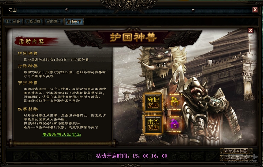 在国家界面→征伐天下→护国神兽界面中,看到护国神兽活动相关规则介绍和奖励。