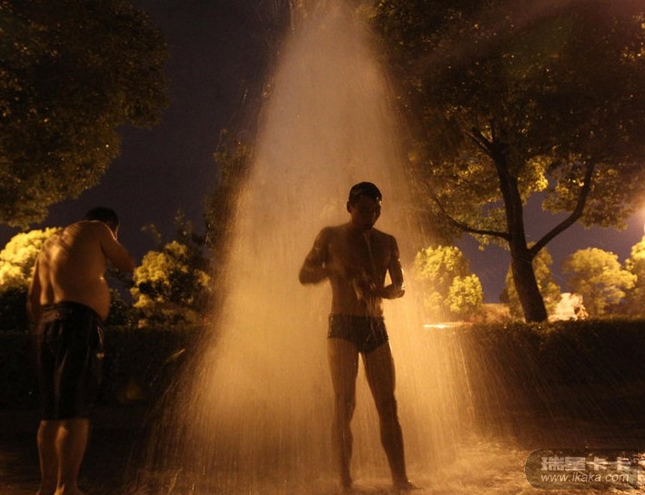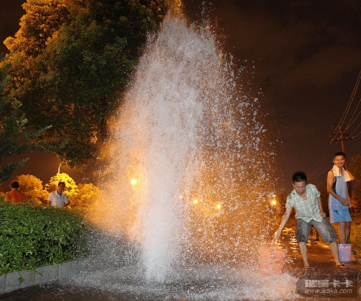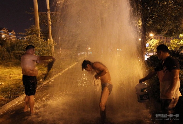 2013年7月17日晚,长沙街头水管爆裂,出现约4米高的水柱,市民趁势洗澡。
