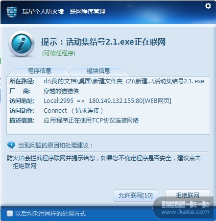 增加正规数字签名或者被瑞星云安全收录的,就会提示信任了。