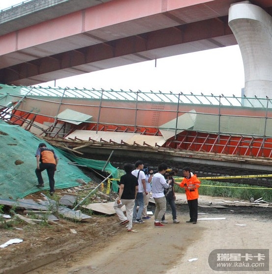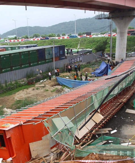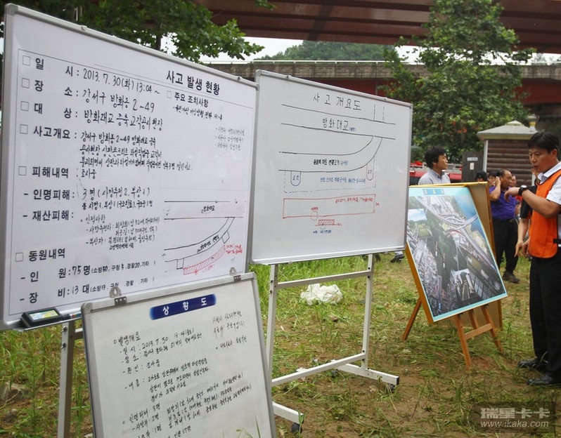 这是7月30日在韩国首尔傍花大桥附近拍摄的发生路面坍塌的施工现场。