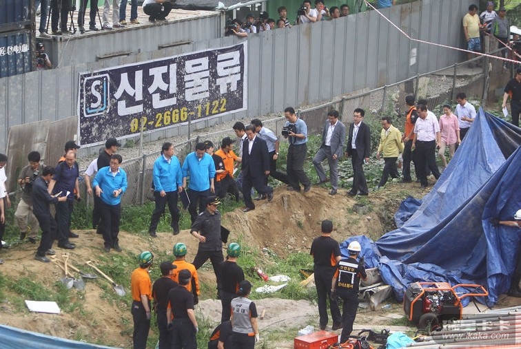 7月30日,在韩国首尔傍花大桥附近事故现场,救援人员展开救援。当日下午,韩国首尔傍花大桥附近一施工现场发生路面坍塌致2名中国工人死亡,1人重伤。