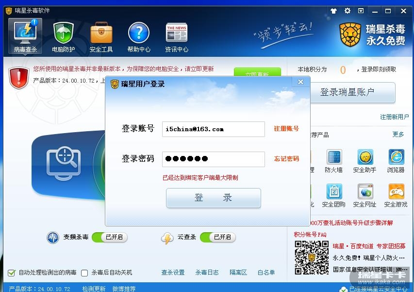 我也不知道,给人家装机器就安装瑞星,总共也差不多吧,看来以后不能给别人安装了,请问,现在如何解决登陆问题??