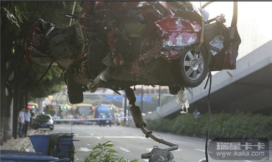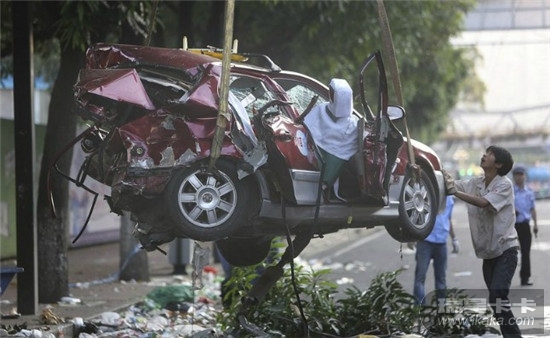 红色出租车尾箱被撞毁并露出液化气装置,后座被挤压得严重变形,几乎成为废铁