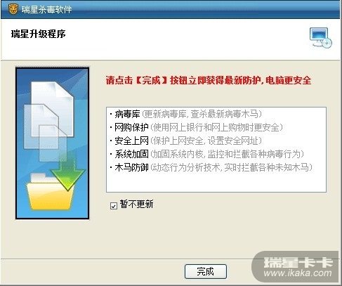 已将您的建议收集反馈。这个弹窗是为了提示您是否设置瑞星安全网址为主页,请勾选暂不更新,再点完成主页就不会被修改了,不影响病毒库和其他功能的更新。