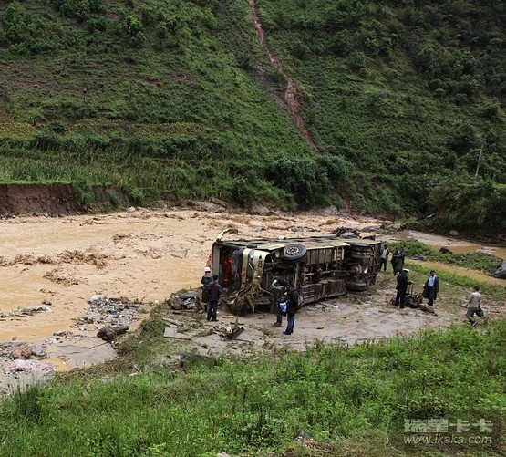 9月9日,被急流冲到下游几百米处的微型车。云南省大理州云龙县只嘎村一桥梁9月8日因山洪泥石流灾害突然断裂,导致一辆大客车和一辆微型车坠河。截至目前已经导致4人死亡,7人失踪,26人受伤送往医院治疗
