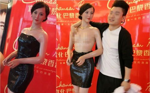 据香港媒体报道,日前于湖北宜昌巿某地产于楼盘营销中心用了多个不同造型的冰冰蜡像搞促销活动,不过参观男士相当猖狂,一名男子竟然将冰冰蜡像的连身裙上半身扯下,并摸着冰冰蜡像的胸部拍照,而另外亦有一位就对着冰冰蜡像咀嘴,不过这些不雅行为,很快便被现场保安阻止。