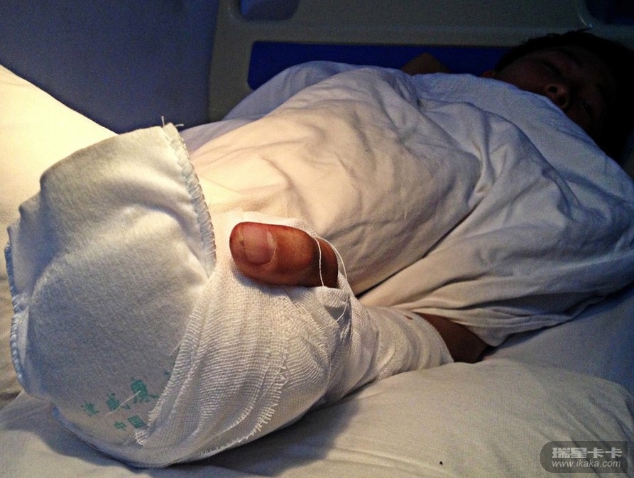 小军说,前天13点多,他们接到同系学生电话,于是赶到事发现场。当时大概有三四百人围着,有多个年级、多个系的学生。“我们系的好多同学都在里面,在一边站着助威,当时对方什么东西都没露出来,等打起来才看见有人拿钢棍、木棍等”。他说,双方动手前,他们并未听见争吵,突然间就打起来了。“我也不知道怎么打的,太混乱了,我们打不过他们,就往男生宿舍楼方向跑,后面有人拿着棍、竹笤帚、钢管等追”。被打的人跑开后,人就都散开了,也就不打了,大概是下午1点40多分。图为一位学生手心被刀划伤躺在病床上治疗。