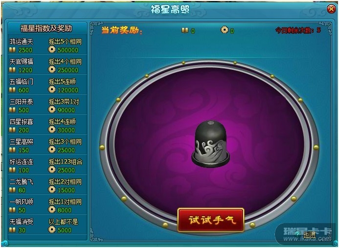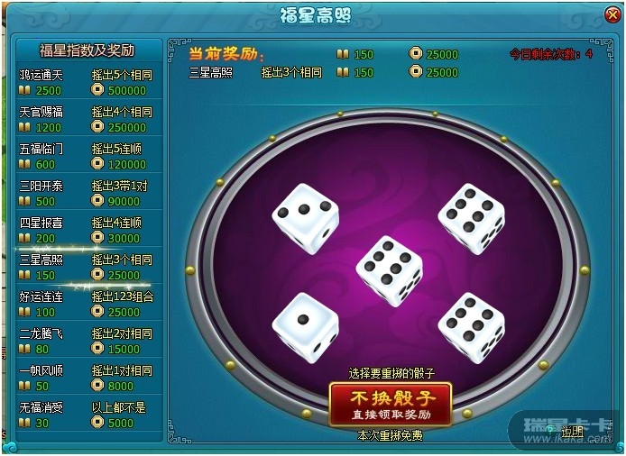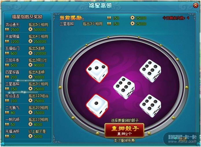 福星高照一.概述啦啦啦~~圣城福星高照开放啦!飞仙各路仙友,走过路过,千万不要错过。赶紧进入圣城,来试试你今天的手气吧,大量的铜钱阅历等着你来拿哦!骰妹友情提示:摇骰子是要动脑,要技巧性的选择需要重掷的骰子,重掷出最高的奖励,只要符合左侧的奖励条件,奖励还可以领取多份!心动了吗?心动不如行动!一起福星高照吧!