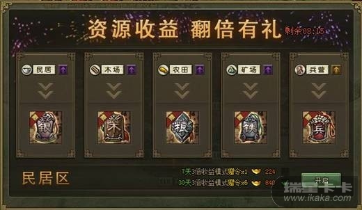 活动内容:活动期间,直接开启任意资源区3倍收益(兵营区为2倍)模式,达到以下要求,即可领取同倍收益的资源令奖励。多开多送!