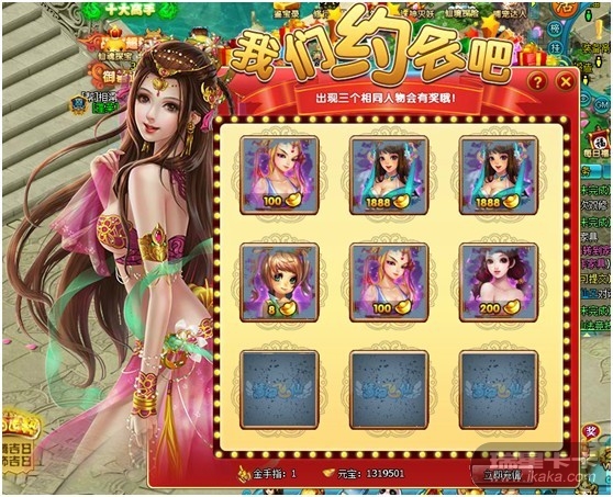 我们约会吧1.活动新玩法,我们约会吧!浪漫又有趣,神秘美女等你刮哦~~~①使用1个金手指可刮9张卡片。(金手指由活动获得)②刮出3钟相同美女的卡片即可获得奖励,最高奖励1288非绑定元宝哦!③刮卡方法:使用鼠标轻点或按住鼠标左键来回刮卡。(真的是刮哦!)