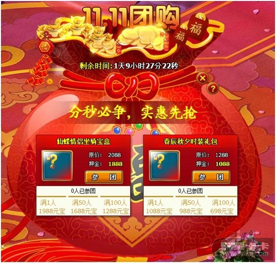 二.团购1.飞仙超值团购惊喜驾到!赶快来团,福利大家一起享!①活动期间内每人可参与团购,参与时需扣除相应元宝作为押金。②活动结束后,将以邮件发放团购道具以及团购押金差价元宝。