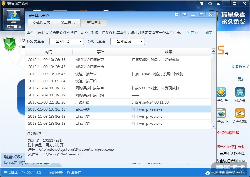 就是重置IE一键还原到最初的安装状态,结果在恢复过程中瑞星阻止了许多浏览器的相关文件,而且启用了自我保护功能。要不您先下载我的附件,在转交给相关的工程师,让他们帮我分析分析。谢谢!
