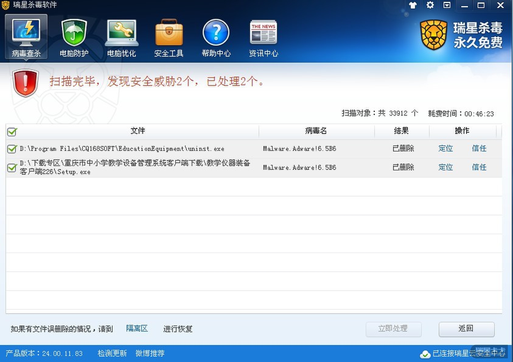 全面查杀扫描出安全威胁2个,并且已经处理2个,