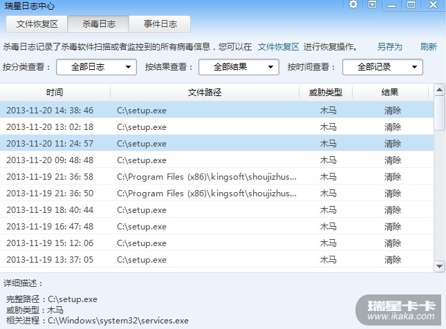 很悲催,文件恢复区没有setup.exe,不能回复,只有在杀毒日志里能看到,杀毒软件检测到时都是直接删除的