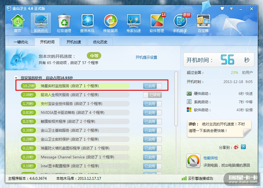 “启动瑞星需要10秒钟左右”您使用什么测试时间的?请发截图看看,截图上传方法请参考: