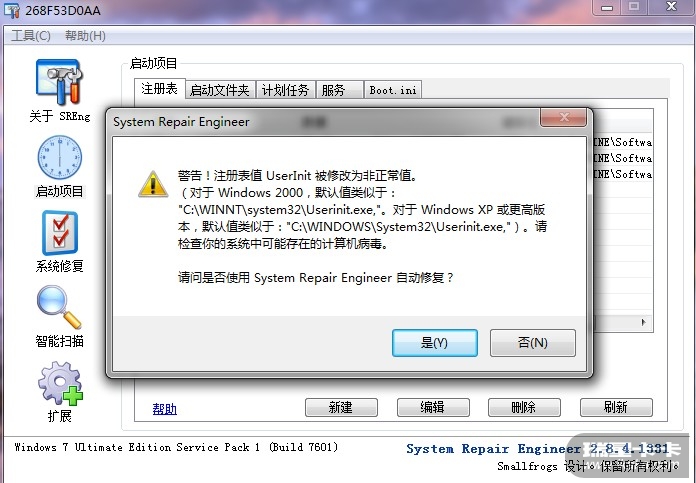 【2】打开sreng点击“启动项目”出现“Userinit被修改为非正常值”这是怎么回事?