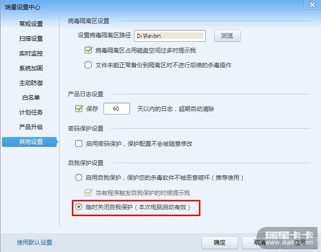 3、关闭离线电脑瑞星的自我保护功能(附图),将先前的文件拷贝到C:\Program Files\Rising\RAV\VirLib目录下。