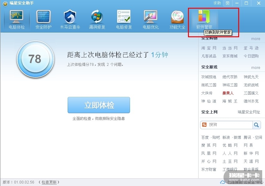 瑞星安全助手中已经集成了瑞星软件管家,详见下图: