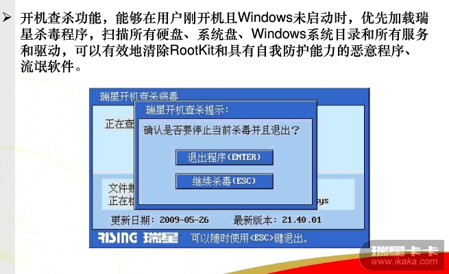 瑞星2010及以前都有开机杀毒,而且还是中文操作界面的哦,只不过后来不知道为什么取消了,很好的功能没了。。。强烈建议加上,这样某些情况下不用进入安全模式就能完成病毒查杀,非常方便