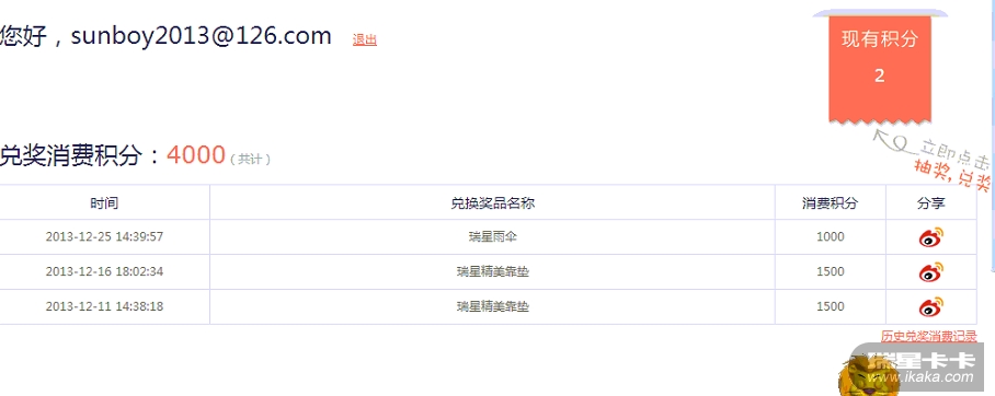 chunbo2003@126.com 和sunboy2013@126.com是我一分一分攥的,加上个别账号兑的雨伞和靠垫积分得的,这个你们后台的积分记录看看就有的。12.11兑了3个枕头、12.24兑了3个枕头前几天刚到;12.25兑了3个雨伞还没到,都是我的名义兑的,你们可查查。收集积分截什么图,怎样看我从刚注册每天点击地项目赚的积分?这两个账号几乎没兑个东西,是我特意攒着得大奖的。单位后天好放假了,家里电脑登不了这两个账号,提示“超过最大限制了”,所以希望客服帮我早点解决。我会一如既往的支持瑞星的。用户系统信息:Mozilla/5.0 (Windows NT 5.1) AppleWebKit/537.36 (KHTML, like Gecko) Chrome/28.0.1500.95 Safari/537.36 SE 2.X MetaSr 1.0