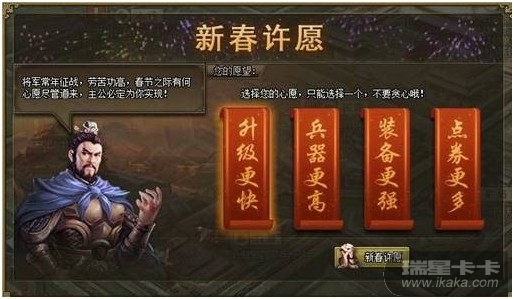 活动内容:a. 许愿:1月27日0点-2月4日24点,玩家可以在“升级更快、兵器更高、装备更好、点券更多”四种愿望中任选其一,进行许愿;