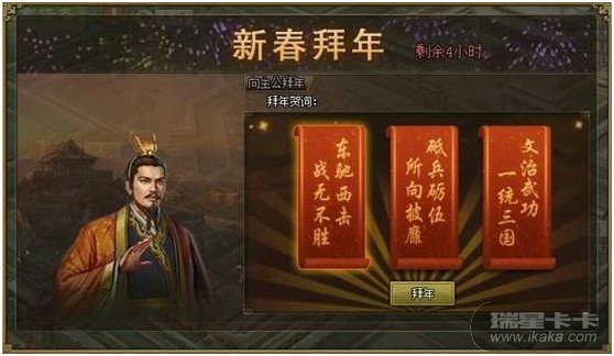 众将:“主公!属下给您拜年啦!预祝主公新的一年里,攻城战无不克!掠地马到功成!”主公:“说的好!哈哈哈……承蒙各位将军吉言,天下一统,指日可待!来人,赐赏!”活动范围:1月30日(含)之前已开所有服活动时间:1月31日0点至2月6日24点活动内容:活动期间,向主公拜年,即可获得如下丰厚赏赐:1.
