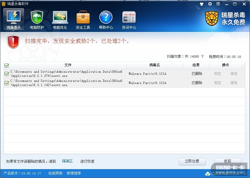 我的瑞星版本是24.00.13.89 为什么查出病毒后却怎么也没有弹出界面啊 到底弹出界面在哪 能不能说的详细点啊