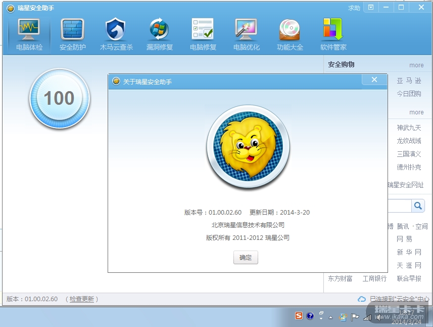 用安全助手体检完毕时,查看“关于”,发现有一处设置不是很合理的地方,建议把它修改成【2014-03-21】而不是现在使用的这个样子。