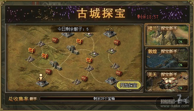 活动内容:活动期间,可任意进入楼兰、敦煌、羌无三大古城地图进行探宝。每张古城地图上有很多宝箱,掷筛子,拿宝箱,经验、粮食等好礼随你拿。(注:本活动每天不重置)
