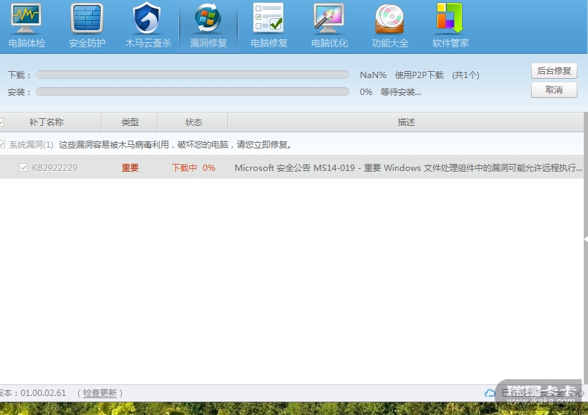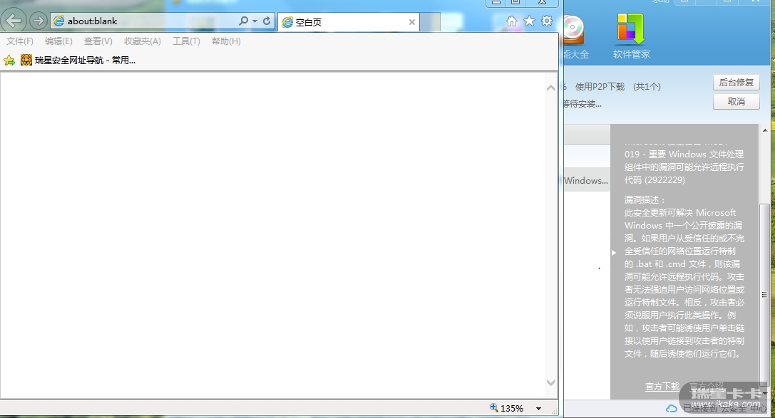 操作系统是win7 32位,上网方式是有线上网,KB2922229一直卡在0%没有反,官网下载打开网页后是空白页。