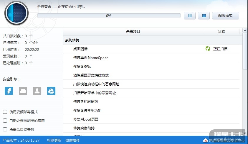 有段时间没用瑞星杀过毒了,今天试了试(已升级),结果发现选择“全盘杀毒”后瞬间就结束了并显示查杀了20个文件,再次选择“全盘杀毒”后,就一直卡在初始化引擎0%,几十分钟都没有反应。