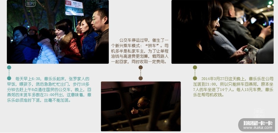 每天早上6:30,章乐乐起床,张罗家人的早饭,喂孩子,然后急急忙忙地出门,步行10多分钟去赶上午8点通往国贸的813路公交车。813路公交车是从她小区通往北京国贸的公司最快捷的一条线路,全程1小时20分钟,偶尔会因为必经的京通高速上某此事故而延长时间。但至少是一站式到达,不用转车,中间这一站全程高速,长达30公里。但是这些有9字头与8字头晚上末班车多在晚20点—21点开出,这就意味着章乐乐如果晚上加班晚一会回家,就只能以与陌生人“拼车”的形式回到燕郊。