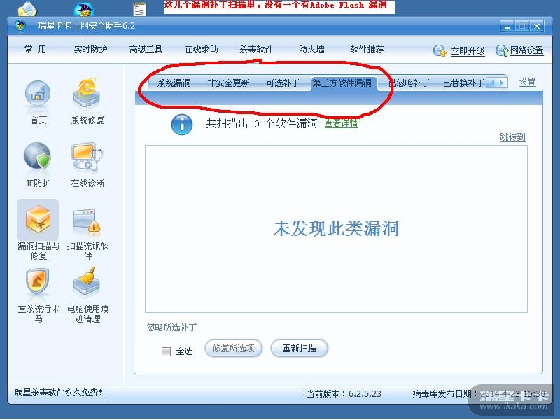 在卡卡助手里的漏洞扫描,没有Flash的漏洞补丁,我已经发现这个问题好久了。