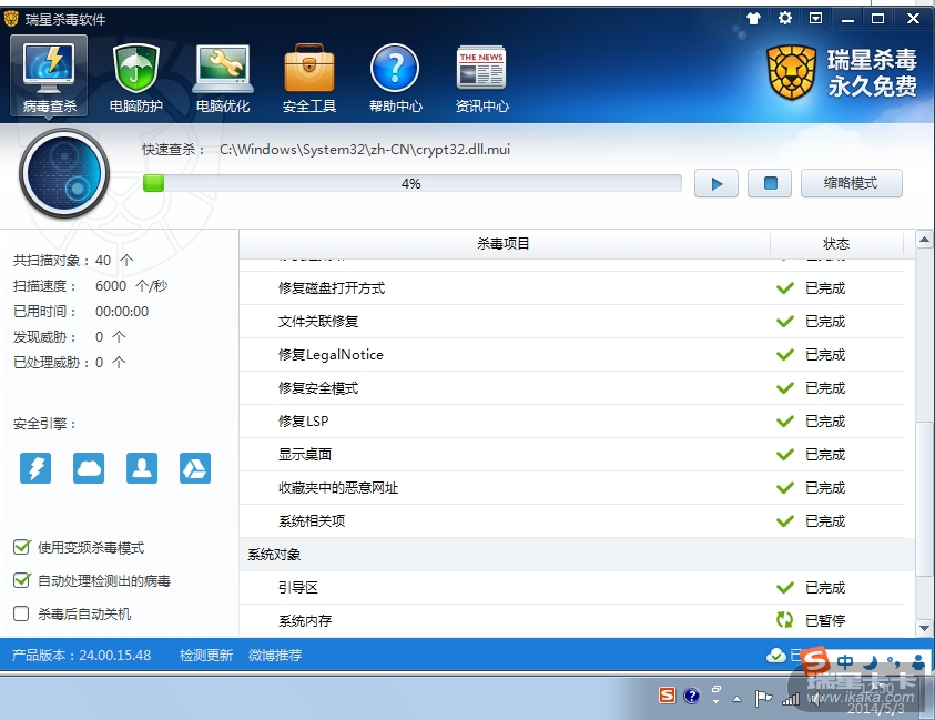 使用快速查杀功能的时候,发现了“扫描速度”和“共扫描对象”的数量完全不相符。(如图所示)