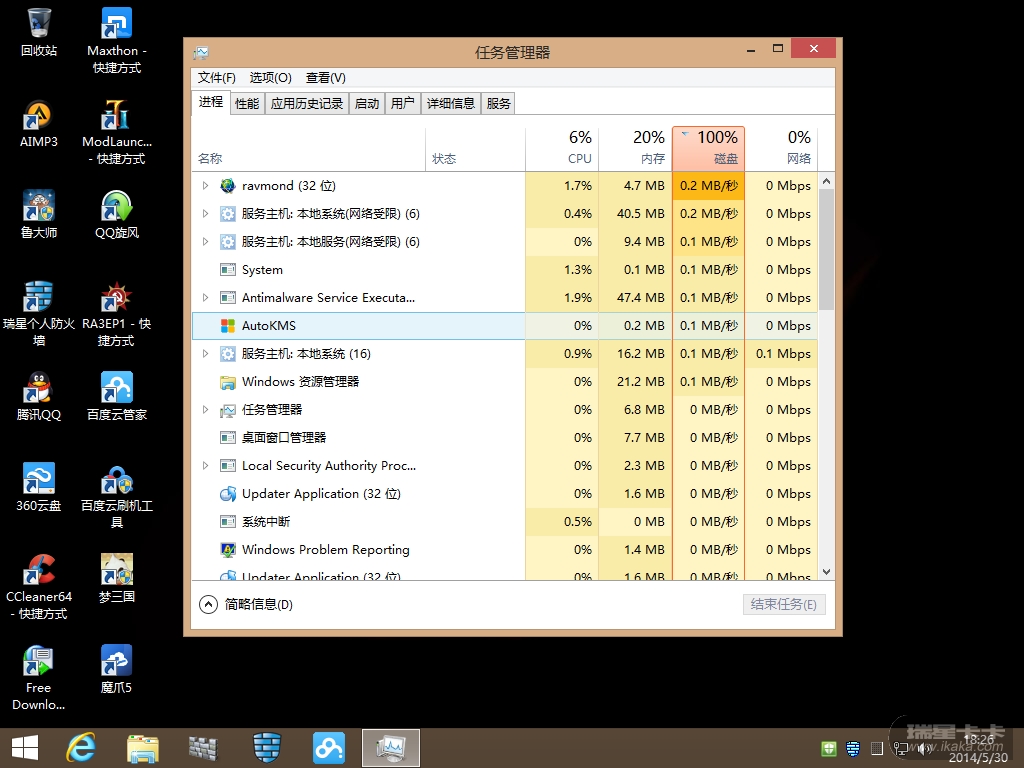 每次开机登录界面后 打开资源管理器唯独磁盘这项占用百分百 其他的内存 cpu都是低于百分5的