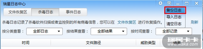 请把瑞星日志db文件导出,压缩跟帖上传至论坛。日志导出方法:鼠标右键托盘处小绿伞图标>>查看日志>>右上角倒三角功能菜单处选择备份日志,把生成的db文件压缩发来。