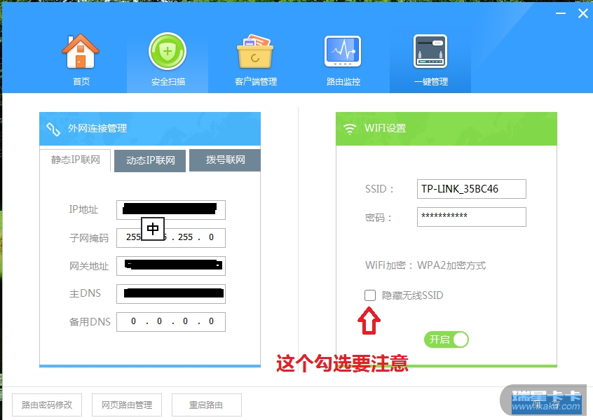 就家庭无线路由而言,还是不要勾选“隐藏无线SSID”为好。(取下图设置)