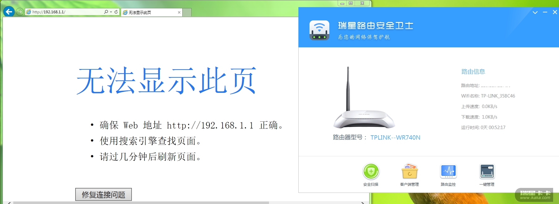 4、此时,点击“瑞星路由安全卫士”的logou,试图用瑞星路由安全卫士打开路由主页——失败。反复尝试N次,结果均如下图: