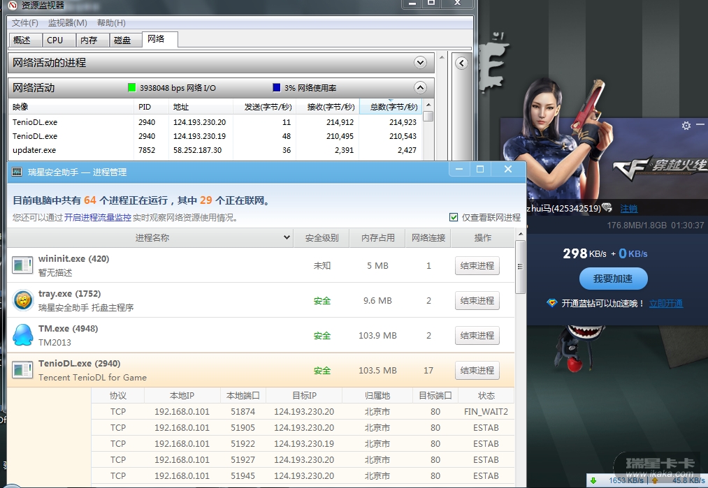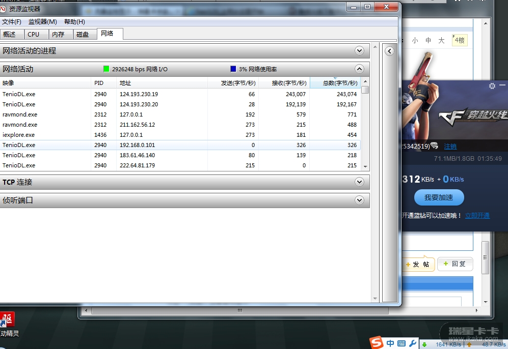 请把鼠标放在瑞星安全助手流量监控的悬浮窗口上,右键选择管理联网程序,打开看看显示的英雄联盟下载的速度是多少?并且请发截图来看看。