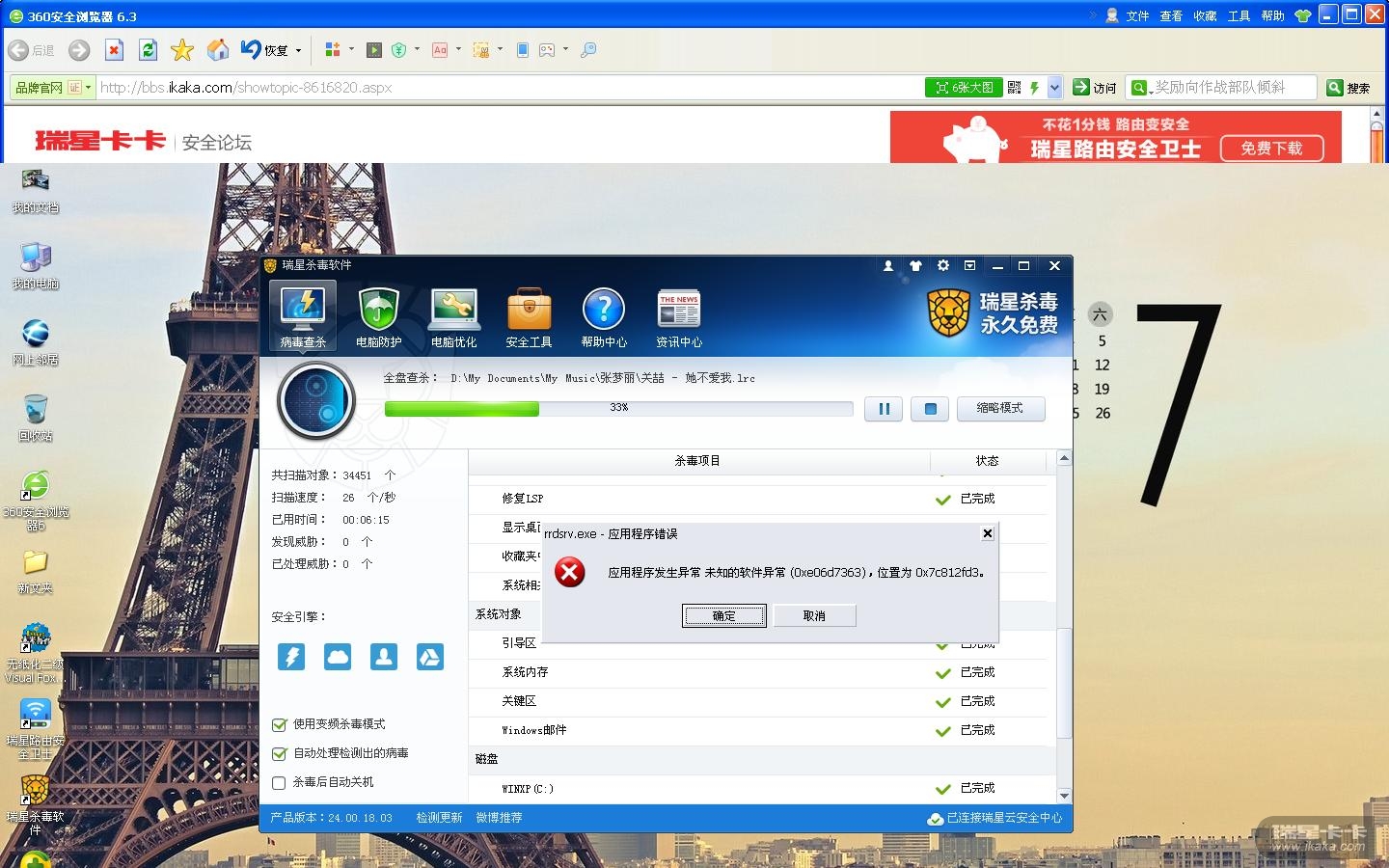看看C:\Program Files\Rising\Rav下有没有dmp文件,发上来