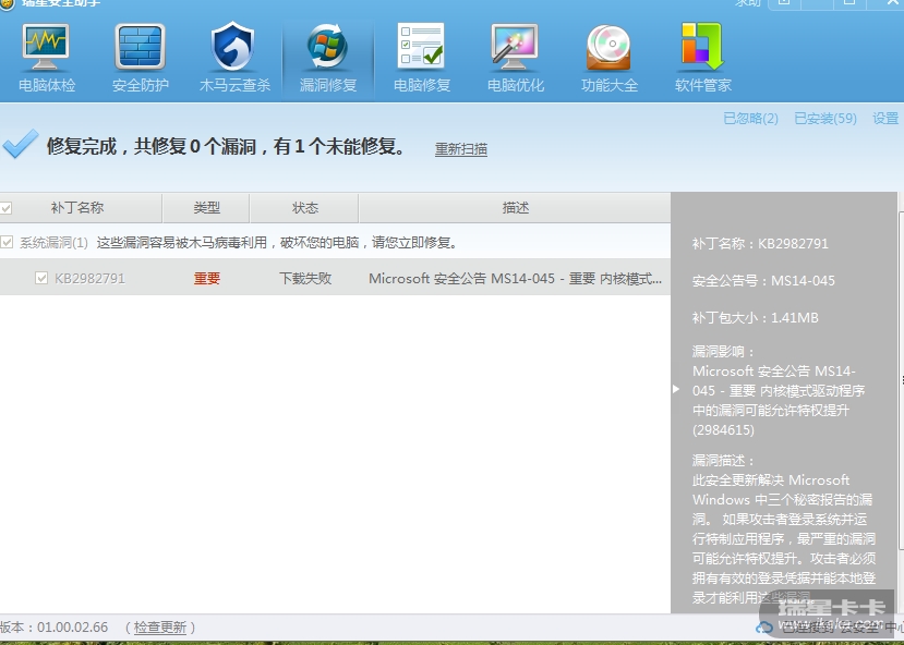 请您先不要打这个补丁,微软官方发布这个补丁存在问题,瑞星安全助手提示需要打 KB2982791的问题,正在解决中,请您耐心等等。