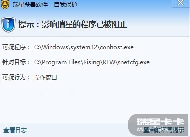 电脑及系统:联想S405超级本,win7 home basic 32位系统。系统运作正常,装有金山毒霸和腾讯管家均为最新版。问题:1、关闭金山和腾讯官家后开启瑞星防火墙24002737版本,弹出程序自我保护提示,conhost.exe针对snetcfg.exe